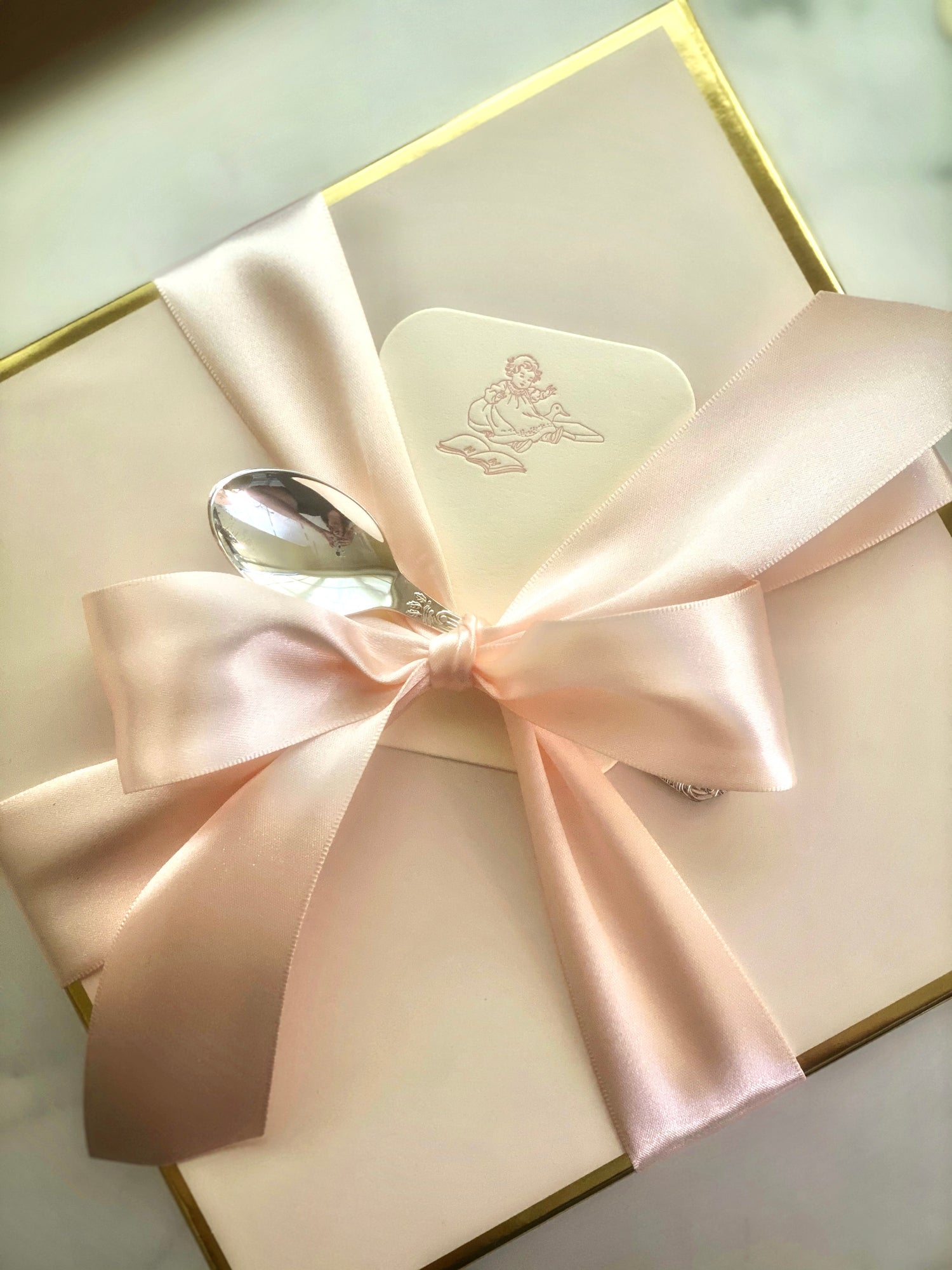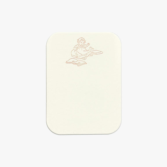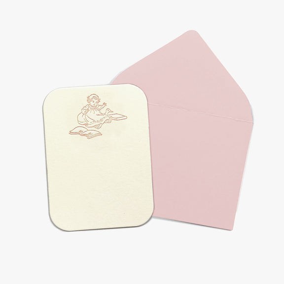 - Design: A young girl seated with a storybook and a toy duck, letterpressed in soft blush pink ink