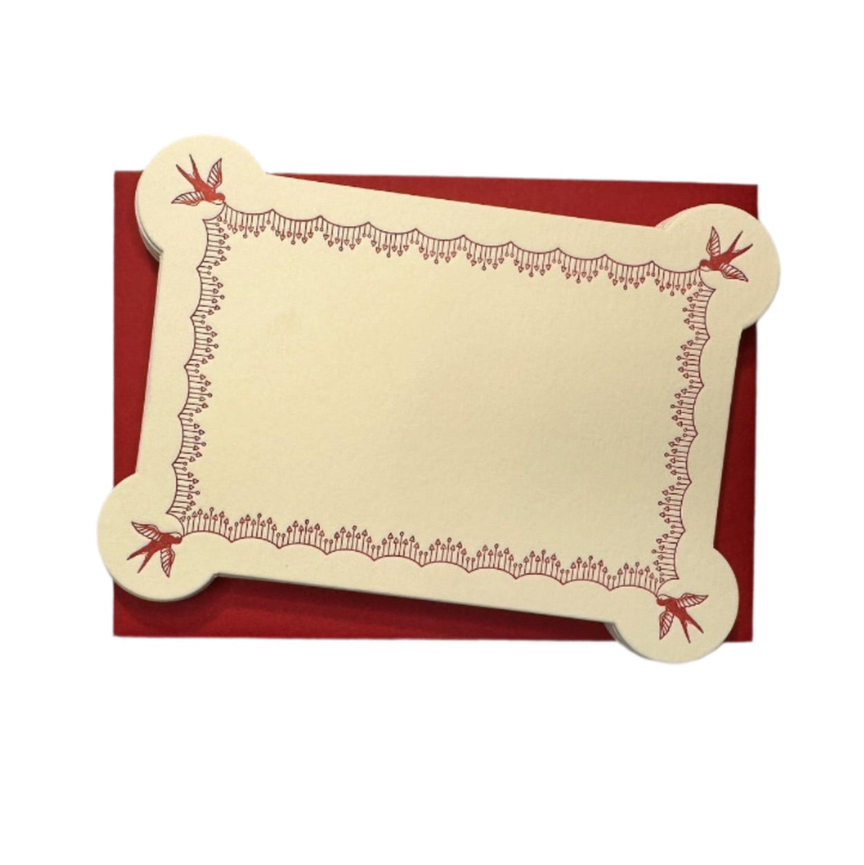 - Design: Swallows holding a scalloped, red heart garland letterpressed in ruby red ink