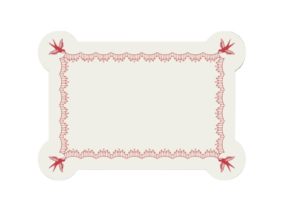 With scalloped borders trimmed in a garland of hearts, proudly held up in each rounded corner by a swallow, our Hearts stationery card is made for daydreams and declarations alike. It feels both romantic and lighthearted—like a ribbon-tied letter, or a secret kept between friends. Whether it’s a valentine, a note of encouragement, or simply a reminder that someone is thought of fondly, this card is a paper keepsake for the heart. Use it to send love without occasion, and it may become the occasion itself.