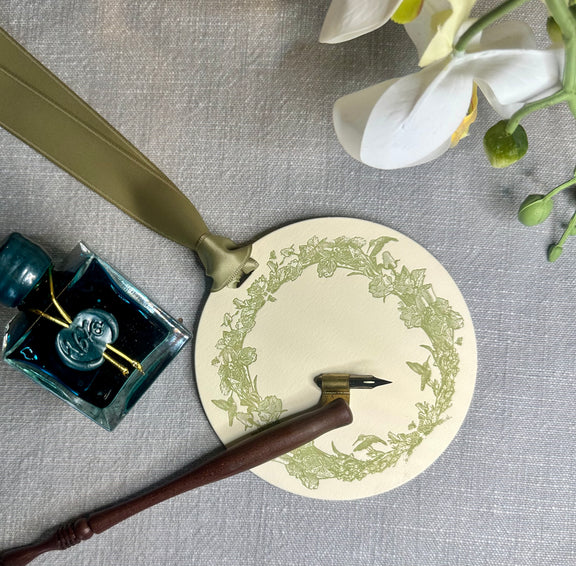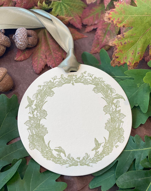 - Design: A finely detailed botanical wreath, dancing with hummingbirds and letterpressed in a soft spring moss green