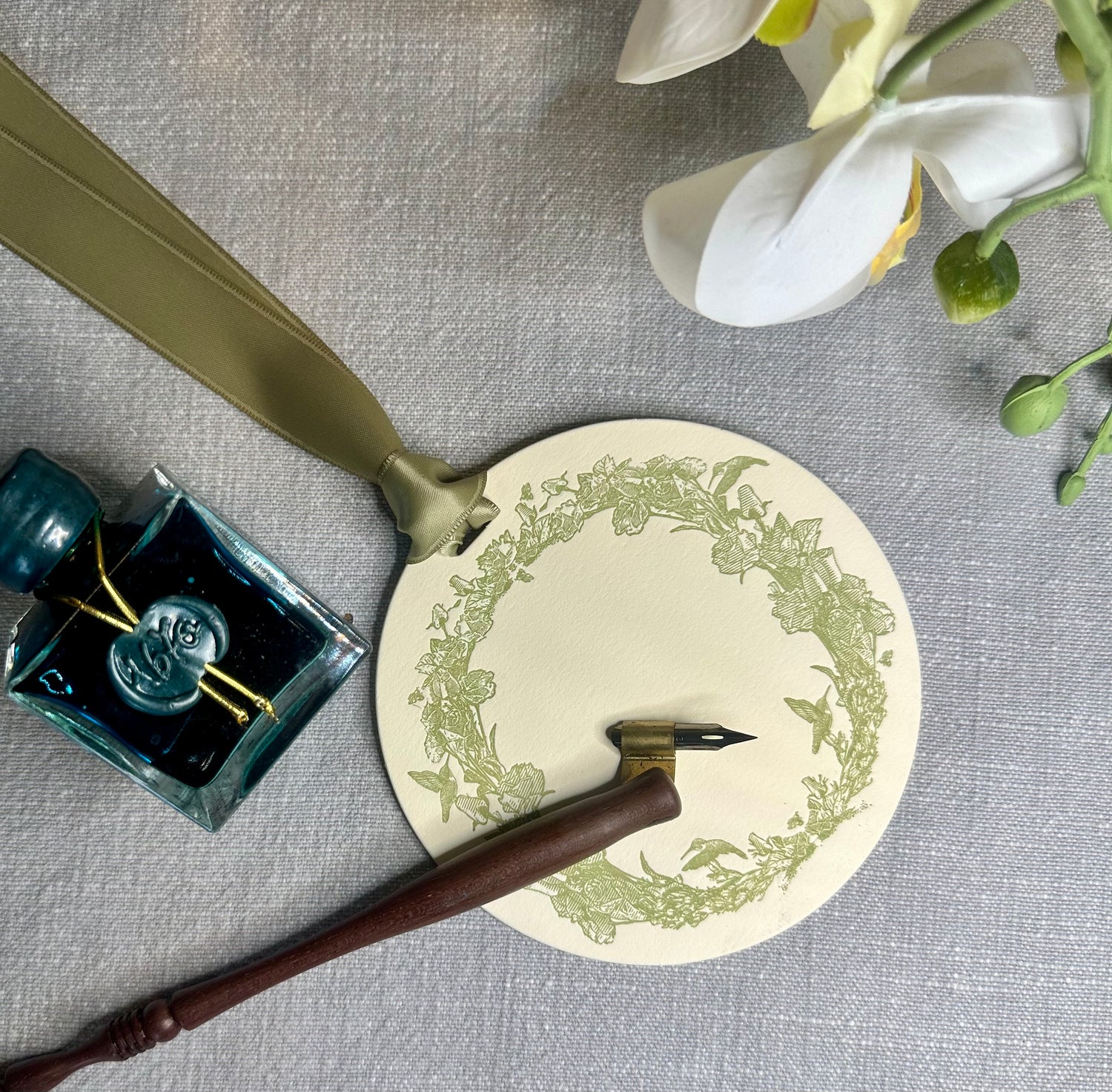 This delicate circular tag features a finely detailed botanical wreath, dancing with hummingbirds. It brings an air of quiet refinement to whatever it touches. This tag is an invitation to linger and notice the beauty in thoughtful details. Whether tied to a gift, used as a place card at a garden-inspired dinner party, or announcing each dish in a wedding buffet, this tag turns the ordinary into something elevated.