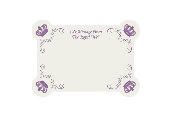 - Design: "A Message From The Royal 'We,'" is designed with royal-purple crowns and graceful flourishes, making every note feel like it carries the weight of sovereign authority