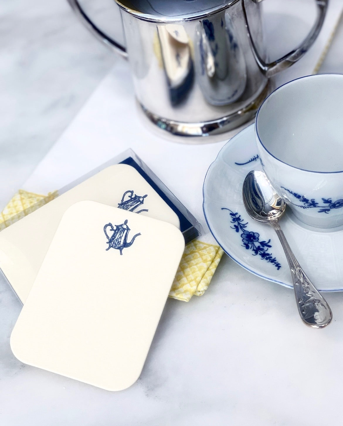 - Design: Blue teapot illustration letterpressed in navy blue ink