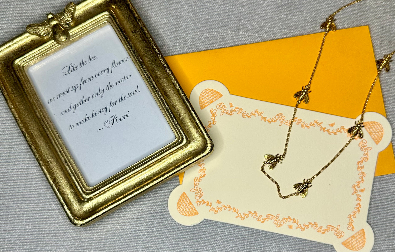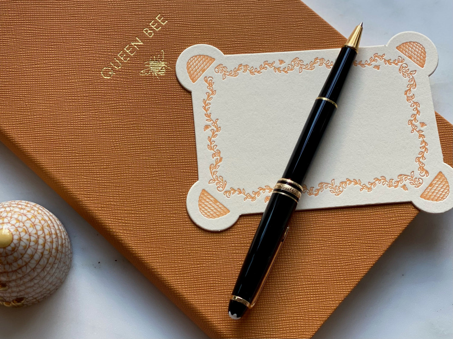 - Design: Laced with tiny leaves, winged with bees, and crowned in each corner by a traditional skep letterpressed in soft goldenrod