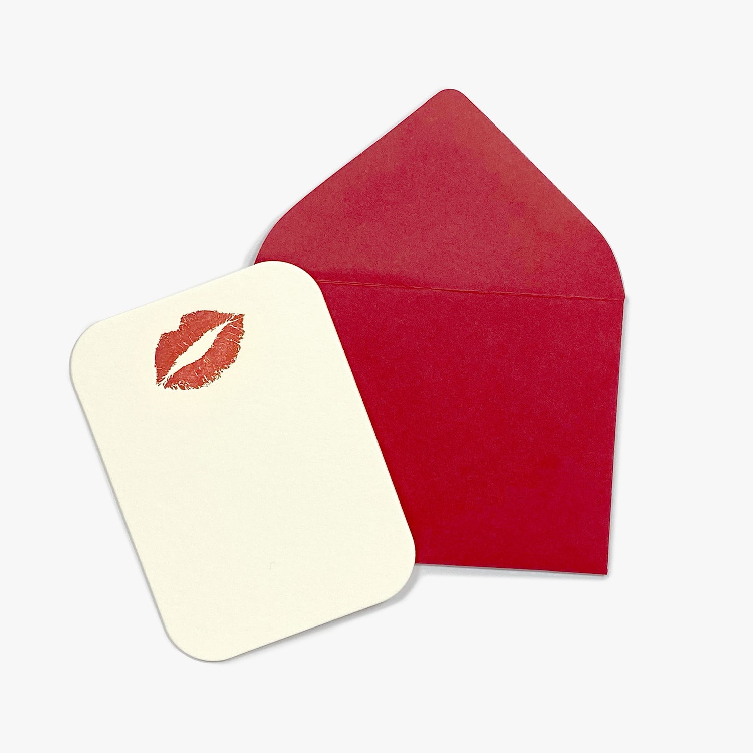 - Design: Red lip print letterpressed in ruby red ink